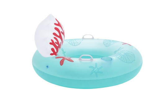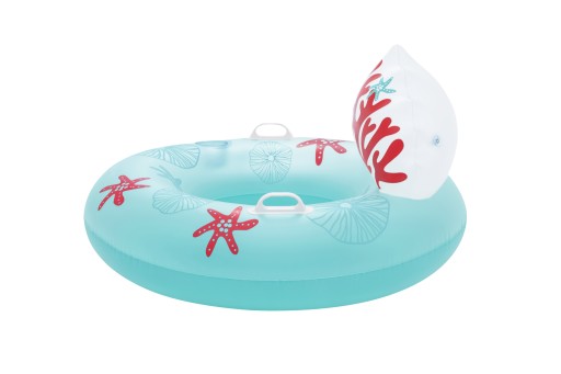Dmuchane koło do pływania Bestway z oparciem, uchwytami i miejscem na napój w ładnej grafice rafy koralowej pozwoli zrelaksować się podczas urlopu.