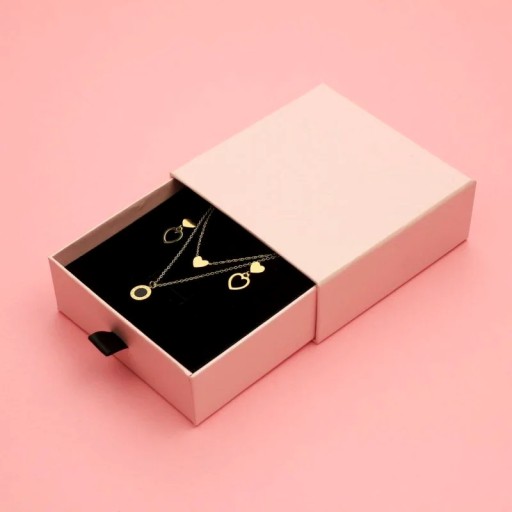 Pudełko wykonano ze sztywnego, trwałego kartonu. Wewnątrz znajduje się wysuwana szufladka z miękkim materiałem w czarnym kolorze, który świetnie podkreśla biżuterię.