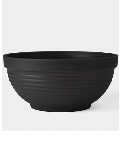 Matowa donica w kształcie misy, wykonana z lekkiego tworzywa sztucznego. Na boku posiada fakturę poziomych prążków.