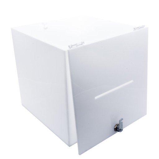SKARBONKA z białej plexi (pmma- polimetaktylan metylu) o grubości ścianki 5mm i wymiarach (szerokość, głębokość i wysokość):