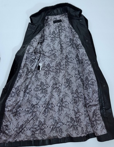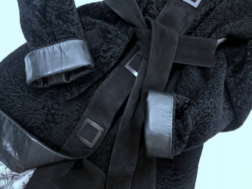 Fason zgrabny taliowany dopasowany do sylwetki,dodatkowo wiązany w talii paskiem,przy szyi kołnierz z naturalnej czarnej norki zapinany tworzy stójkę.Wewnątrz lekko ocieplany dodatkowo fizeliną, kożuszek dopracowany w najmniejszym detalu.