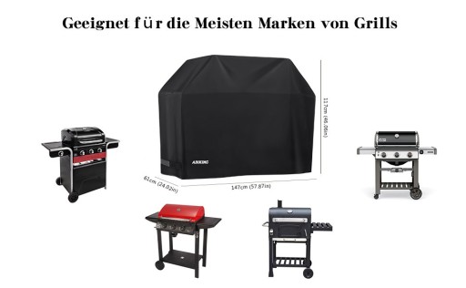 Wymiary pokrowca na grilla wynoszą 147 x 61 x 117 cm. Osłona jest wystarczająco duża, aby pokrowiec na grilla pasował do najpopularniejszych marek grilla.