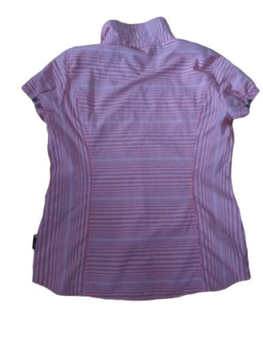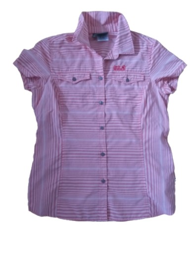 Witam. Jak nowa koszula z krótkim rękawkiem JACK WOLFSKIN UV SHIELD w stanie idealnym. Rozmiar z metki; UK-16, EU-L, ASIA-XL, US-L. Logo wyszyte z przodu, logowane guziczki+1 zapasowy, poliester 100%.