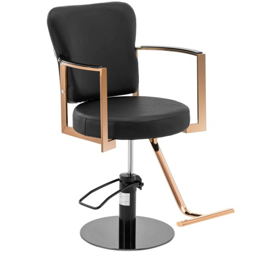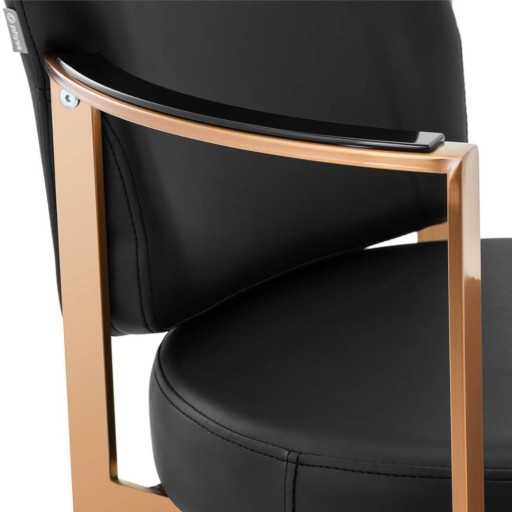 Fotel fryzjerski marki Physa sprawdzi się zarówno w salonie fryzjerskim, tatuażu, jak i kosmetycznym. Jego atrakcyjny wygląd w kolorze czarnym z dodatkiem różowego złota dodaje stylowego akcentu w salonie. Krzesło posiada elegancki złoty podnóżek. Fotel wyposażono w wygodne wysokie podłokietniki. Pianka, którą wypełniono mebel jest miękka i zachowuje swój kształt. Jest łatwa w czyszczeniu, odporna na kurz i wodę. Wysokość regulowana jest w zakresie 900- 1050 mm za pomocą pompy hydraulicznej. Krzesło można obrócić o 360°. Stelaż fotela fryzjerskiego wykonany został z wytrzymałej i eleganckiej stali nierdzewnej. Konstrukcja wytrzymuje obciążenie do 200 kg, co przekłada się na wysoki poziom trwałości. Duża podstawa o średnicy 45 cm zapewnia mu dodatkową stabilność. Gładkie złote powierzchnie podkreślają jego stylowy wygląd.