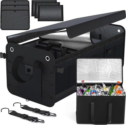 Bardzo mocny sztywny organizer samochodowy z wodoodpornej tkaniny z mobilną termiczną saszetką na mrożonki i zimne napoje.
