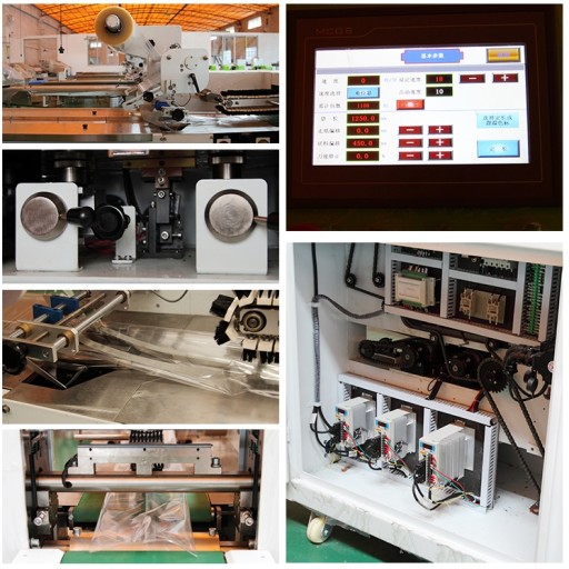 2. Łatwe, dokładne i szybkie ustawienie długości opakowania za pomocą ekranu dotykowego oszczędza czas i ogranicza zużycie folii opakowaniowej, możliwość zapisania 99 programów maszyny, sterownik automatycznie synchronizuje prędkości szczęk zgrzewjąco-tnących, podajnika i materiału opakowaniowego dzięki zastosowaniu serwomotorów.