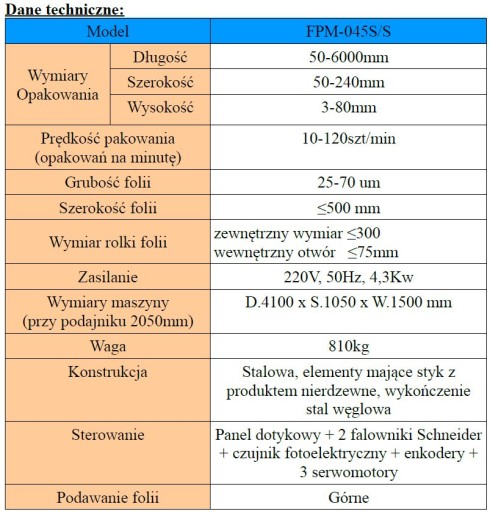 FPM-045S nadaje się do produktów takich jak ciastka, herbatniki, chleby, słodycze, artykuły medyczne, art. codziennego użytku, szczoteczki do zębów, kartoniki, tacki, itp.