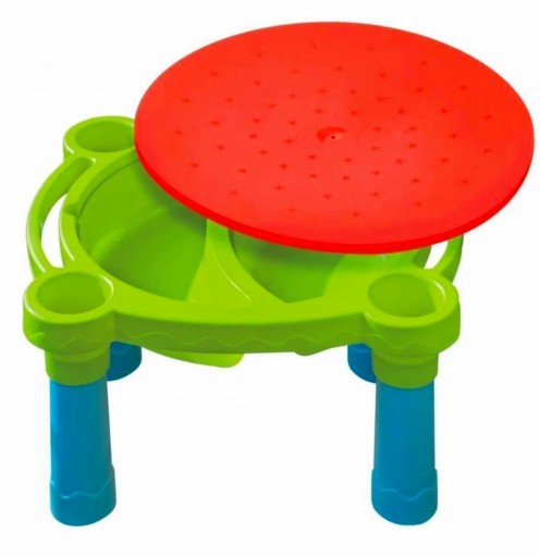 Stolik posiada dwie powierzchnie do zabawy. Pierwsza z nich ma dwie przegrody - jedną na piasek i drugą na wodę. Po założeniu pokrywy, która pełni też funkcję blatu, stolik przekształca się w idealne miejsce do rysowania, pisania i bawienia się klockami.