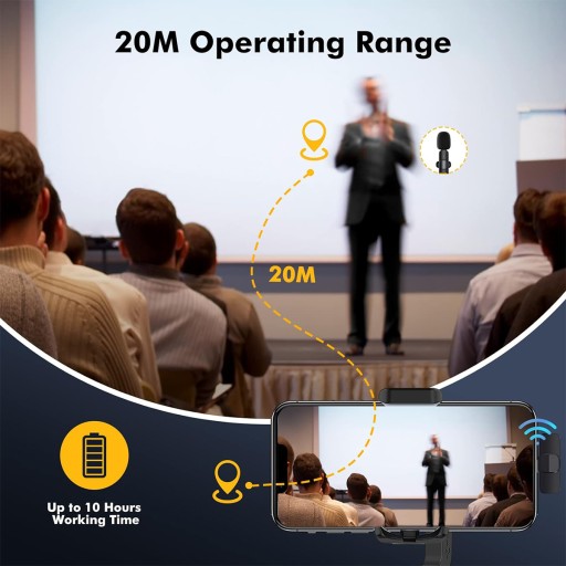 Mikrofon bezprzewodowy o wysokiej wydajności zapewnia stabilność sygnału Bluetooth. Odległość robocza to aż 20 M od odbiornika bez przeszkód w nagraniu.