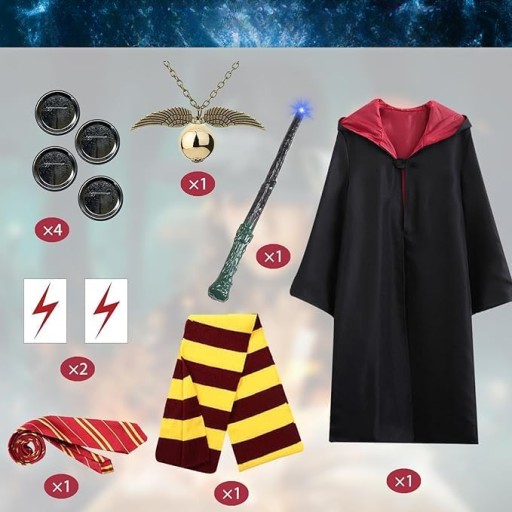 - Zestaw kostiumów magika Zestaw kostiumów czarodzieja obejmują: pelerynę, różdżkę, naszyjnik, krawat, odznakę, okulary, szalik. Kostiumy mają idealne dodatki, które tworzą kompletny strój imprezowy.