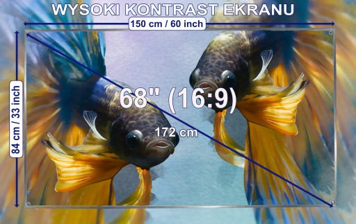 Zapraszamy Państwa do zakupu EKRANU PROJEKCYJNEGO EPS 68 KR format 16:9 HD. Ekran produkowany jest w Polsce z wysokiej jakości, gęstej tkaniny akrylowo poliestrowej. Zastosowany splot eliminuje refleksy oraz zapewnia duży kontrast, jasność i kąt widzenia obrazu. Oferujemy sześć rozmiarów; 55 cali, 68 cali, 80 cali, 83 cale, 112 cale i 137 cale. Na tej aukcji ekran ma przekątną 68” (wyświetlany rozmiar obrazu 150 cm x 84 cm).