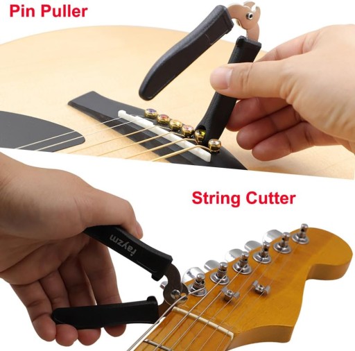 - 【Maszyna do obcinania strun gitarowych i ściągacz do szpilek】: Wykonana jest z najwyższej jakości stali węglowej i żywicy o wysokiej wytrzymałości, jest odporna na przecięcie strun gitarowych (nawet strun basowych 2,5 mm) w ciągu sekundy. Posiada wbudowany ściągacz do pinów, który z łatwością usuwa piny z mostka gitarowego.