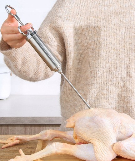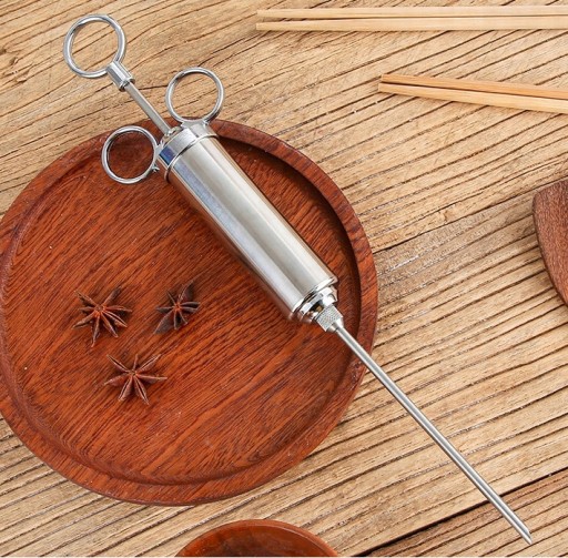 Strzykawka do mięsa ze stali nierdzewnej jest wykonana ze stali nierdzewnej klasy spożywczej 304 i można ją łatwo przebić przez twarde mięso. Bezpieczna uszczelka z silikonu.