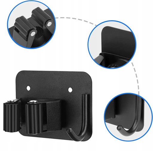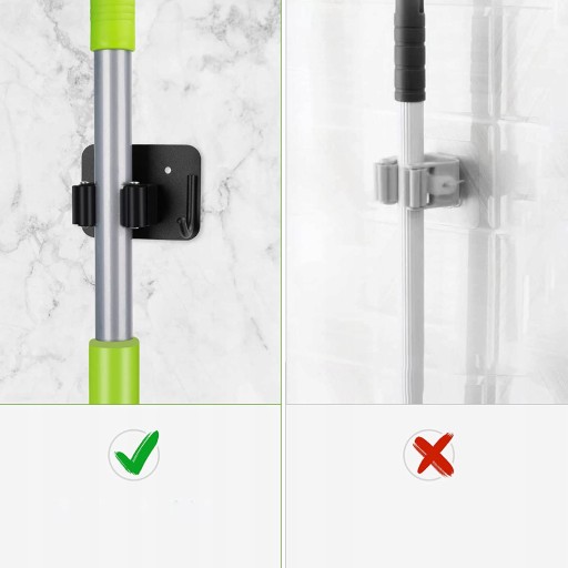 - Wieszak na mopa i miotłę ma antypoślizgowe, sprężynowe i podwójne gumowe rowki, które zapobiegają ślizganiu się mokrych mopów, trzonków miotły, brudnych grabek, kijów bejsbolowych, parasoli i innych narzędzi.