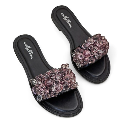 Płaskie klapki z kryształkami na paseczku to wyjątkowe połączenie stylu i wygody. Cholewka i wkładka wykonane ze skóry ekologicznej nadają im elegancki wygląd. Wygodna, płaska podeszwa - dodaje im komfortu!