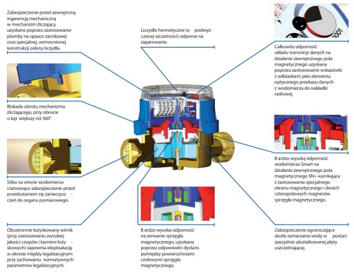 ✅ Odporność na silne, zewnętrzne pole magnetyczne – aktualnie najlepiej zabezpieczony na rynku wodomierz suchobieżny przed działaniem zewnętrznego pola magnetycznego. Odporność na działanie zewnętrznego pola magnetycznego kilkakrotnie przewyższa wymagania określone w normie PN-EN 14154.