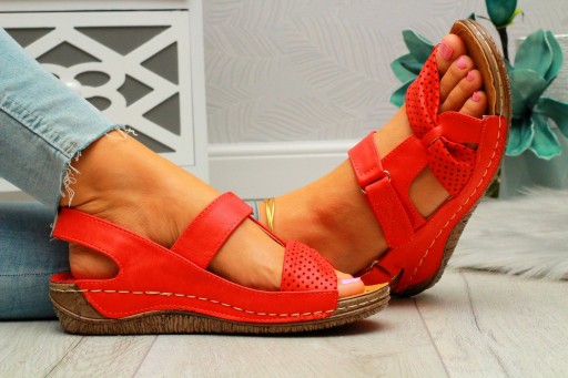 Damskie sandały na grubej podeszwie w kolorze czerwonym. Komfortowa, profilowana wkładka sprawia, że idealnie nadają się do codziennego użytkowania. Prosty fason w czarnym kolorze dopasuje się do wielu stylizacji. Zapięcie na rzep ułatwia wkładanie. Szyta podeszwa skutkuje dłuższą wytrzymałością obuwia. ❗