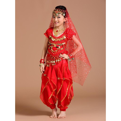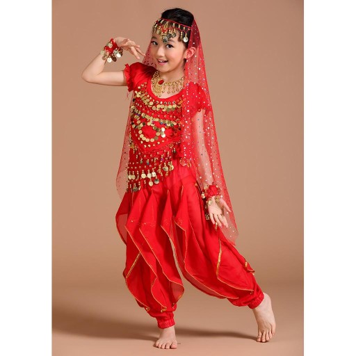 Kids Belly Dance Costume Coin Tassel Top Harem Pant Hip Scarf Set