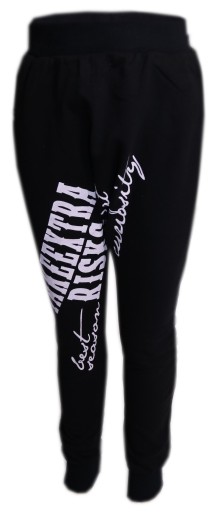 Spodnie maja obniżony krok, od spodu posiadają ocieplający meszek, w pasie guma lekko rozciągająca, po bokach kieszenie, na dole ściągacze, spodnie mają obniżony krok