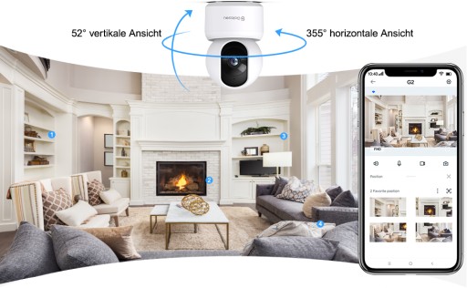 Kamera WLAN GALAYOU do użytku w pomieszczeniach z kątem widzenia poziomego 355 stopni i 52 stopni w pionie umożliwia łatwe monitorowanie całego pomieszczenia.