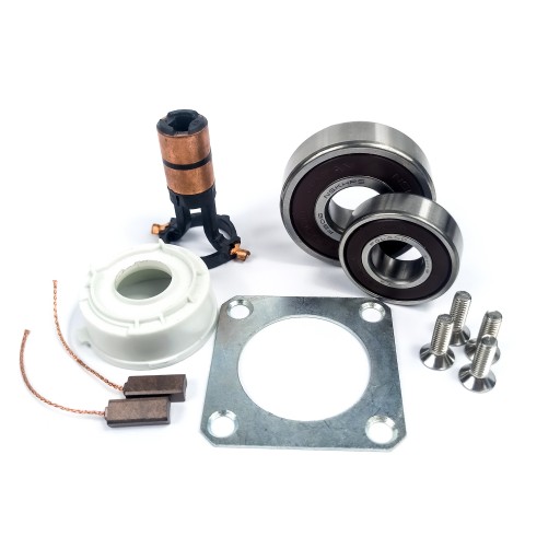 W zestawie znajduje się zabezpieczenie przedniego łożyska które czasami ulega uszkodzeniu podczas wyciskania wirnika z obudowy oraz 4 śruby.
