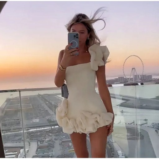 Zachwycająca i zmysłowa, ta wieczorowa sukienka mini z odrytymi ramionami to esencja elegancji i kobiecego wdzięku.