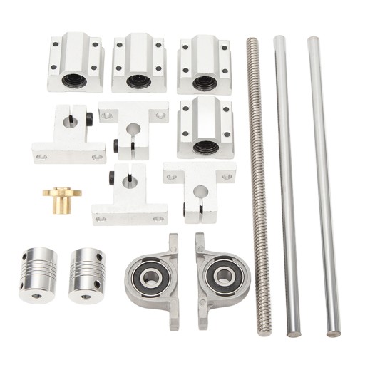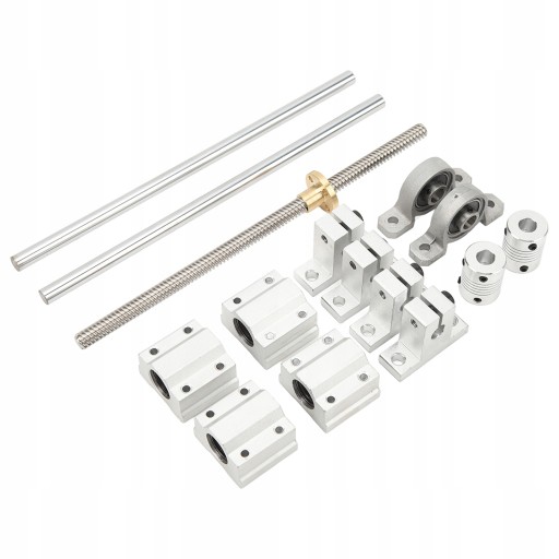 Funkcja:1. Zawartość zestawu: Zestaw wału prowadnicy liniowej zawiera 2 wały prowadnicy liniowej, 4 bloki łożyska ślizgowego SC8UU, 4 wsporniki wału, 1 śrubę pociągową, 1 nakrętkę, 2 łożyska pionowe, 2 elastyczne sprzęgi wału.