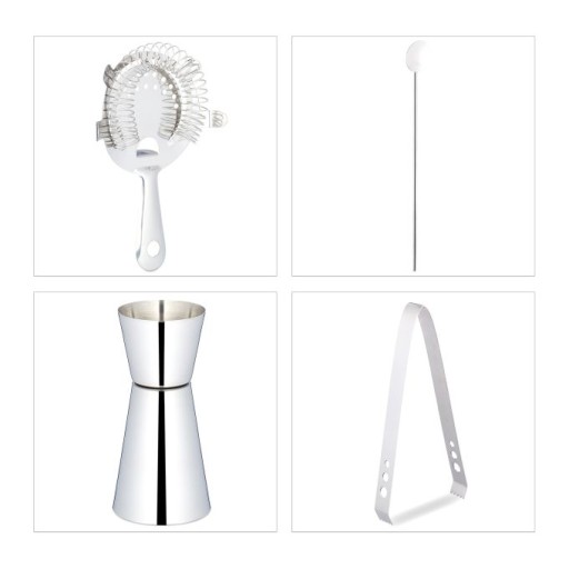 - 5-częściowy: kompleksowy zestaw koktajlowy składający się z shakera, jiggera, szczypiec, łyżki do mieszania i sitka