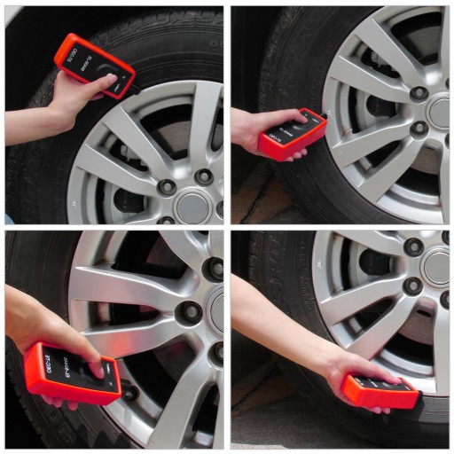 - Rozpocząć od lewego przedniego koła, ustawić antenę J-46079 lub przyrząd diagnostyczny EL-50448 w stronę rdzenia zaworu i blisko krawędzi boku opony, przyrząd do pomiaru ciśnienia w oponach El-50448 uruchamia się wyłącznikiem startowym.