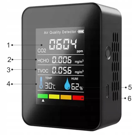 Termohigrometr z funkcjami detektorów gazów (CO2, HCHO, TVOC) sprawdzi się w każdym pomieszczeniu. Jest pomocny w dbaniu o twoje samopoczucie oraz zdrowie. Posiada również wbudowany termometr oraz wilgotnościomierz.