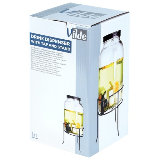 Zestaw składający się ze słoja z kranikiem oraz stojaka na słój. Idealny do serwowania wody, lemoniady, soku, herbaty mrożonej, wody smakowej, ale również ponczu. Dzięki kranikowi w łatwy sposób zaserwujemy ulubione napoje w sposób efektowny. Słój ze stojakiem wykorzystamy zarówno w ogrodzie, jak i podczas spotkań rodzinnych. Dzięki zamykanej pokrywie żadne owady nie dostaną się do naszego napoju. Wykonany jest z materiałów bezpiecznych dla zdrowia i neutralnych dla żywności. Nie nadaje się do napojów gorących. Uwaga! Na opakowaniu widnieje błędna informacja dot. pojemności, faktyczna pojemność jest zgodna z powyższym opisem. Oryginalny produkt marki Vilde. Wyprodukowano zgodnie z europejskimi standardami.