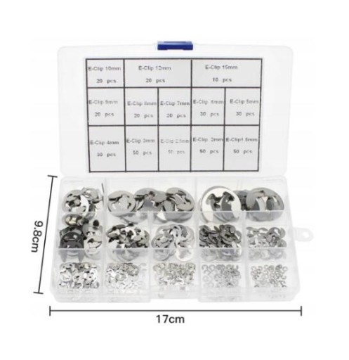 Cechy: Zestaw wielokrotnego użytku: zestaw e-clip pierścienia ustalającego o 13 różnych rozmiarach, dobry do mocowania łożysk, kół zębatych, kół pasowych, osi, wałów i innych ruchomych części Materiał premium: wykonany ze stali nierdzewnej 304, o doskonałej odporności na rdzę, mocno i długo utrzymujący się, odpowiedni do użytku wewnątrz i na zewnątrz Szeroki zakres rozmiarów: 1,5 mm, 2 mm, 2,5 mm, 3 mm, 4 mm, 5 mm, 6 mm, 7 mm, 8 mm, 9 mm, 10 mm, 12 mm, 15 mm, 13 powszechnie stosowanych rozmiarów i łącznie 380 sztuk. Futerał do przechowywania: każdy rozmiar jest starannie umieszczony w osobnej przegrodzie w przezroczystym futerale do przechowywania, aby łatwo uzyskać potrzebny rozmiar.