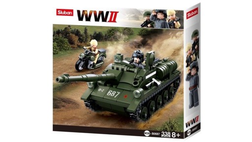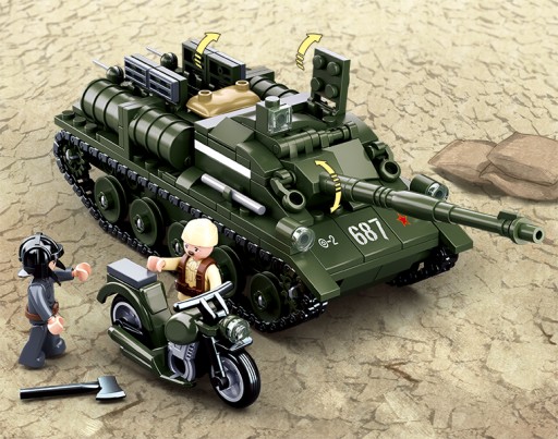 KLOCKI WZOROWANE NA - Niszczyciel Czołgów SU-85 - średnie działo samobieżne konstrukcji radzieckiej z okresu II wojny światowej, niszczyciel czołgów. Działo samobieżne SU-85 opracowane zostało w 1943 roku w biurze konstrukcyjnym zakładów Uralmasz w Swierdłowsku. Konstrukcja bazowała na wcześniejszym modelu SU-122, który z kolei został zbudowany na podwoziu czołgu T-34. Głównym zadaniem nowej konstrukcji było eliminowanie nowszych modeli czołgów niemieckich (np. Panzerkampfwagen V Panther; Panzerkampfwagen VI Tiger). Wyprodukowano łącznie ok. 2050 egzemplarzy.