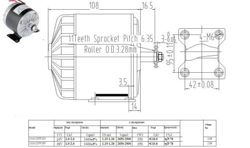 - Na osi silnik posiada zamontowaną zębatkę 11 zębów.