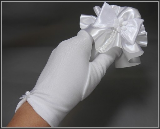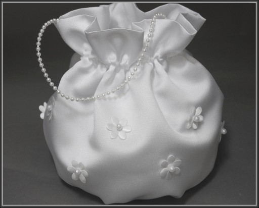 Komplet komunijny. Rękawiczki pięciopalczaste i torebka komunijna w kształcie woreczka z ręcznie naszywanymi perełkami na satynowym kwiatku. Wykonana z satyny bardzo dobrego gatunku z usztywnianą wkładką, pomagającą w zachowaniu kształtu woreczka nawet po obciążeniu. Na pozostałych aukcjach można produkt ten kupić w zestawieniu z rękawiczkami i okapnikiem.