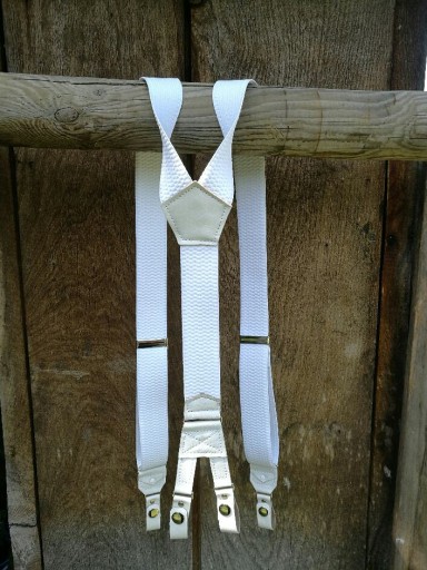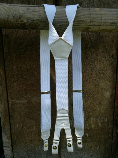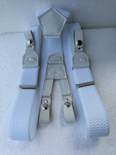 WYKONANE Z DOBREJ JAKOŚCIOWO GUMY SZELKOWEJ.POSIADAJĄ REGULACJĘ DŁUGOŚCI A SOLIDNE SZLUFKI I KARABIŃCZYKI DOBRZE UTRZYMUJĄ SPODNIE NA PASKU.PO ODPIĘCIU SZLUFEK SZELKI MOGĄ BYĆ MOCOWANE DO SPODNI ZA POMOCOM KARABIŃCZYKÓW.WSTAWKI WYKONANE SĄ Z WYSOKO GATUNKOWEJ SKÓRY LICOWEJ KOLORU BIAŁEGO DZIĘKI TEMU SZELKI BĘDĄ SŁUŻYŁY PRZEZ DŁUGI CZAS.SREBRNY KOLOR METALOWYCH KARABIŃCZYKÓW,RAMEK,NAPY,REGULATORÓW,NITÓW.GUMA SZEROKA NA 4 CM.ROZCIĄGAJĄCA SIĘ NA 170 CM.SZLUFKI SKÓRZANE PASUJĄ NA SZEROKOŚĆ PASA OD 3 CM DO 4 CM.