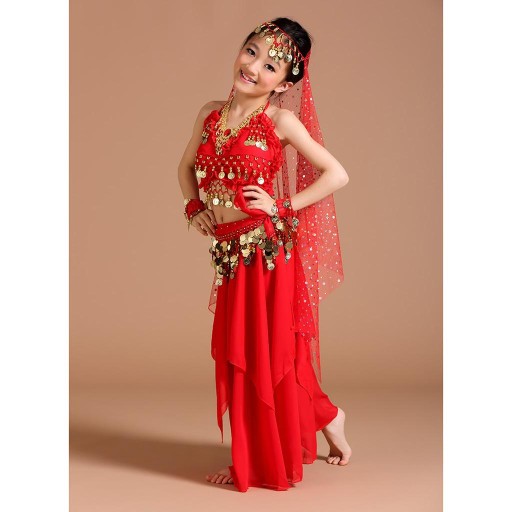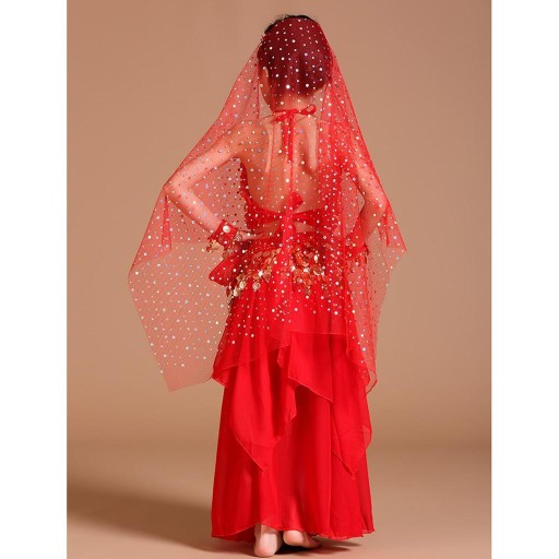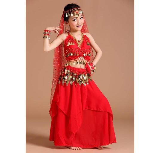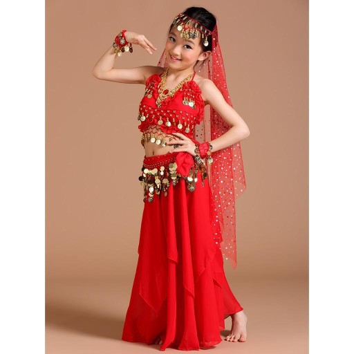 Kostium do tańca brzucha dla dzieci Moneta z frędzlami Halter Spódnica Zestaw szalików na biodra M Czerwony