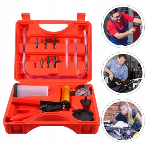 Comprehensive workshop vacuum pump kit includes reservoir and adapter for brake and fuel line bleeding. The hand operated pump pulls the fluid through the bleed nipples, eliminating need to use the brake lever or pedal.