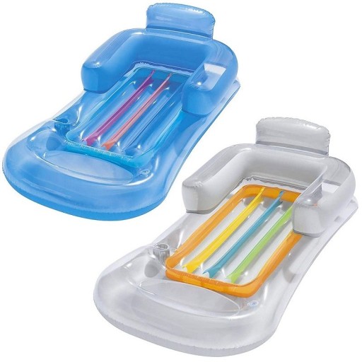 Dodatkowym atutem jest otwór w materacu na zanurzenie stóp w celu ochłody oraz miejsce do trzymania napoju. Kolorowy wielofunkcyjny materac z nadmuchiwanymi bokami oraz oparciem zapewni niesamowity komfort podczas letniego wypoczynku. Materac został wykonany z wytrzymałego winylu w ładnym srebrzysto-szarym kolorze z przeźroczystymi i kolorowymi elementami. W komplecie znajduje się łatka łatka naprawcza.