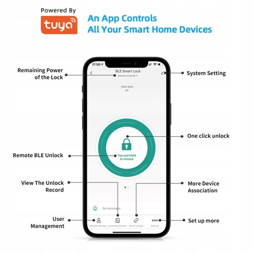Użyj z aplikacją Tuya, możesz zdalnie odblokować drzwi w celu szybkiego dostępu, sprawdzić członka, odblokować rekordy, ustawienia itp., przy wysokim poziomie bezpieczeństwa.