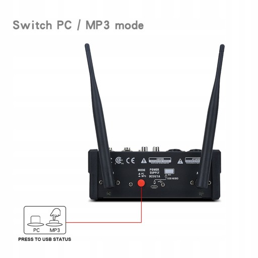 Przełącznik wyboru trybu: po podłączeniu do interfejsu USB komputera w celu zasilania, ten przełącznik trybu podskakuje, odtwarzacz MP3 przechodzi w tryb pracy karty dźwiękowej USB, a po naciśnięciu wchodzi w tryb odtwarzania dysku U lub trybu pracy Bluetooth ; w przypadku korzystania z przenośnego zasilacza lub adaptera do zasilania, naciśnięcie tego przełącznika trybu powoduje przejście odtwarzacza MP3 do trybu odtwarzania dysku U lub trybu pracy Bluetooth.