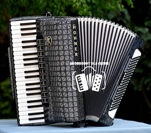 Akordeon niemiecki Hohner Atlantic IV Musette ( fabryczne ) 120 basów 4 chóry .Instrument po przeglądzie klawiatura spłycona , korekta stroju , nowy powłoka lakiernicza kolor czarna perła plus brokat , który mieni się w słońcu wszystkimi kolorami , nowe pasy nośne ,nowe kaliko na miechu ,pas basowy oraz poduszka osłona miechu , kompresja bardzo dobra wszystkie głosy grają i stroją . Gotowy do grania bez żadnych wkładów finansowych tak dla profesjonalisty jak i dla początkującego do nauki , nowy futerał w komplecie.Gwarancja rozruchowa