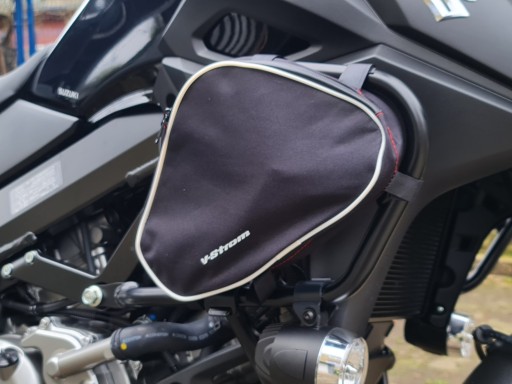 Dopasowanie nie jest idealne, ale da się zamontować stabilnie torby z oryginalnymi gmolami Suzuki.