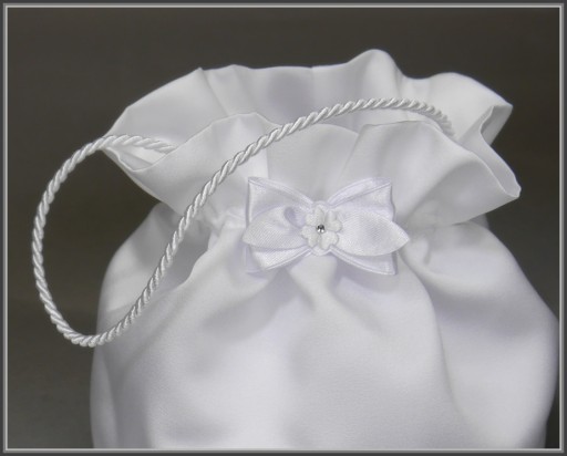 Torebka satynowa w kształcie woreczka z usztywnianą wkładką pomagającą w zachowaniu jego kształtu nawet po obciążeniu. Ozdobiona ozdobiona satynową kokardka z kwiatkiem i dżetem. Woreczek został uszyty z pierwszego gatunku satyny ślubnej i posiada sztywną wkładkę pomagającą w zachowaniu kształtu nawet po obciążeniu. Do torebki można dopasować np. profitkę na świecę komunijną lub rękawiczki. Dostępne na naszych pozostałych aukcjach.