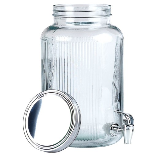 Szklany dystrybutor z kranikiem idealny do serwowania wody, lemoniady, soku, herbaty mrożonej, wody smakowej, ale również ponczu. Dzięki kranikowi w łatwy sposób zaserwujemy ulubione napoje w sposób efektowny. Słój wykorzystamy zarówno w ogrodzie, jak i podczas spotkań rodzinnych. Dzięki zamykanej pokrywie żadne owady nie dostaną się do naszego napoju. Wykonany jest z materiałów bezpiecznych dla zdrowia i neutralnych dla żywności. Nie nadaje się do napojów gorących. Uwaga! Na opakowaniu widnieje błędna informacja dot. pojemności, faktyczna pojemność jest zgodna z powyższym opisem. Oryginalny produkt marki Vilde. Wyprodukowano zgodnie z europejskimi standardami.