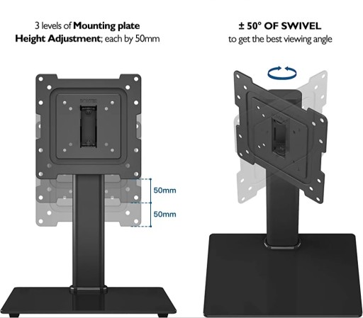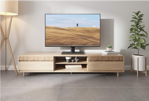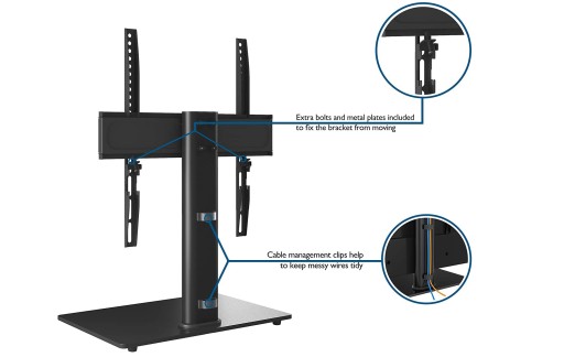 Wysoka stabilność i trwałość: Wykonana z wysokiej jakości stali walcowanej na zimno podstawa utrzymuje telewizor o wadze do 45 kg stabilnie i bezpiecznie. Dodatkowo, podstawa ze szkła hartowanego może służyć jako miejsce na komponenty AV.
