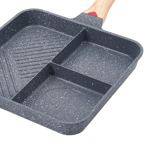 [Podzielona]: Ta patelnia grillowa ma trzy podzielone obszary gotowania, dzięki czemu możesz gotować różne rzeczy w tym samym czasie. Śniadanie można przygotować na patelni.