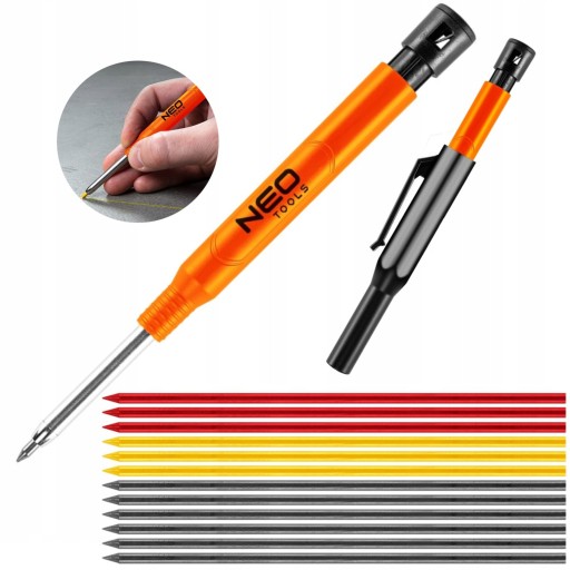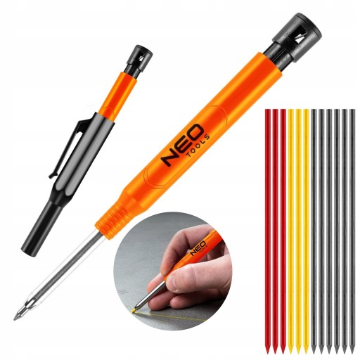Ołówek, rysik automatyczny z temperówką plus 12 wkładów 13-816 NEO to narzędzie przeznaczone do wszelkiego rodzaju oznaczania powierzchni. Umożliwia wygodne zaznaczenie punktu wiercenia lub cięcia na drewnie, płaszczyźnie drewnopodobnej, papierze, metalu, kamieniu czy szkle. Wykonany w gustownym czarno-pomarańczowym kolorze nawiązuje do logo marki NEO.