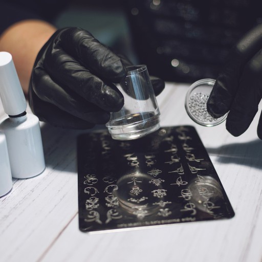 - Na wybrany wzór na blaszce nałóż lakier hybrydowy.