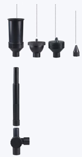 - Trójnik z regulacją pozwalający dostosowanie podawania ilości wody na fontannę i na kaskadę, jest to jednocześnie regulacja wysokości tryskania fontanny